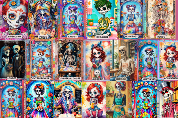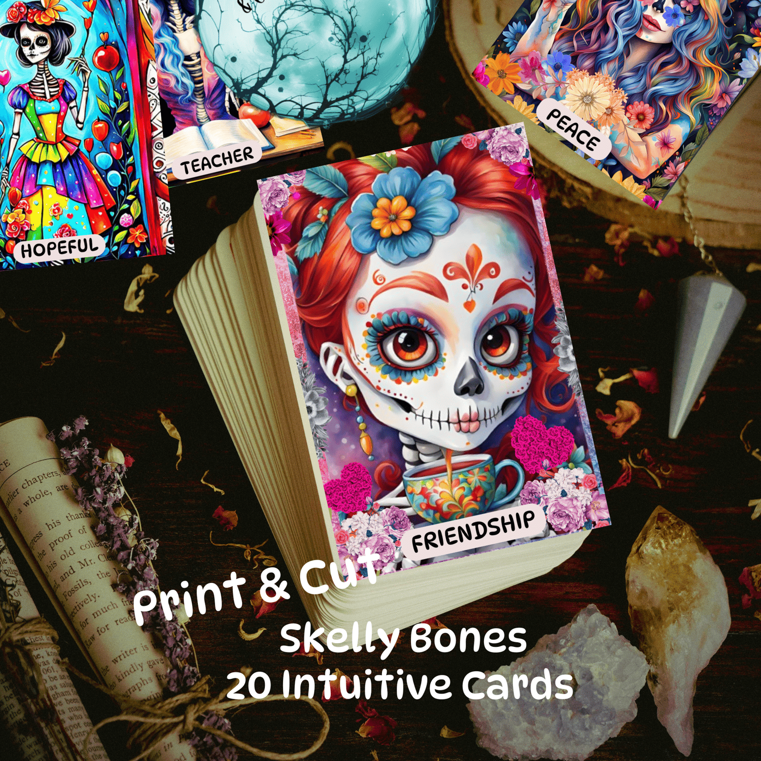 This Skelly Bones printable clarifying oracle card deck is a one-of-a-kind print-and-cut skeleton reading card deck featuring 20 vividly illustrated cards, each adorned with intricately designed, colorful skeletons that symbolize wisdom from beyond. Every card carries a unique theme, blending the mystical with the whimsical. The deck is designed for intuitive readings, offering guidance on personal transformation, fate, and hidden truths. Printed in vibrant hues against striking backgrounds, the cards bring a lively yet eerie aesthetic, making them perfect for both casual readings and serious spiritual insight.