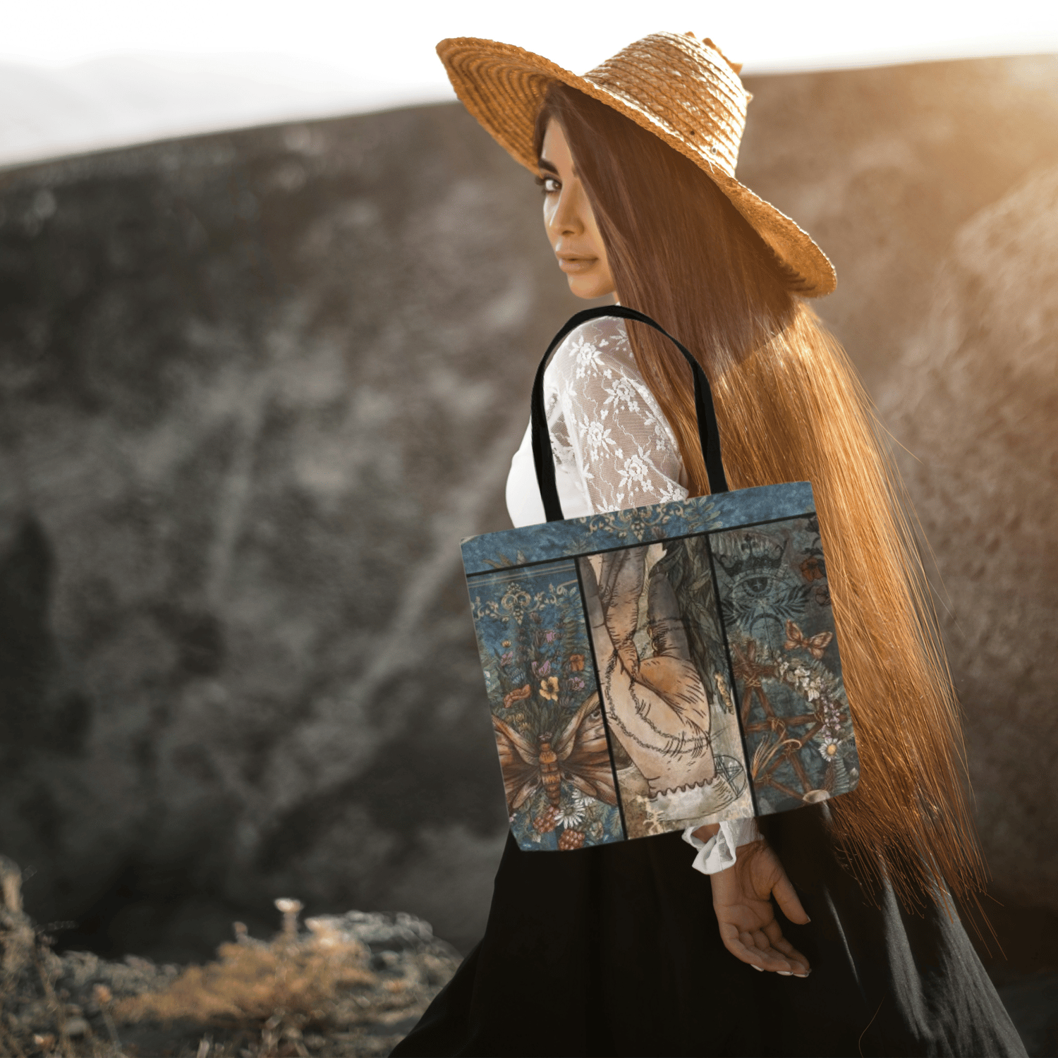 Perfect for carrying your tarot card decks, crystals, journals, or any of your go-to essentials. This tote is made of 100% polyester and adorned with a sturdy black cotton handle for grounded elegance. Let this mystical tote remind you to move through life with light, warmth, and purpose—wherever your spiritual journey takes you. Lightweight, artsy, and full of good vibes—your new favorite everyday companion!